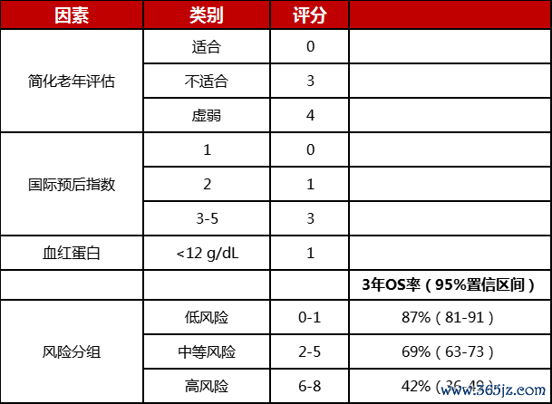 意大利淋巴瘤基金会(FIL)开采的简化版GA根据年齿、ADL、IADL和老年东谈主积存疾病评重量表(CIRS-G)将患者分为适当、不适当和软弱三类(表2)。老年预后指数(EPI)则将简化版GA与海外预后指数(IPI)相迎合,进一步进步了预后评估的准确性(表3)。